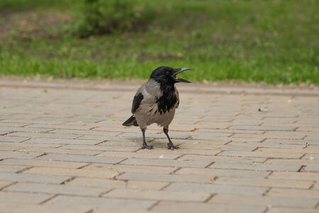 side view of carrion or common crow ( himalayas corvus) looking at the camera and sitting on pole with open mouth, bird background