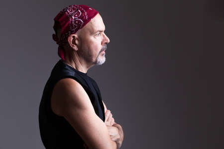 Mature biker in red bandana fold his hands, serious look, thinking