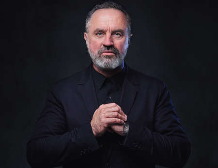 Self confident aged man dressed in black suit