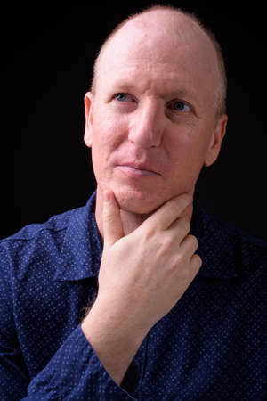 Face of bald businessman thinking and looking up