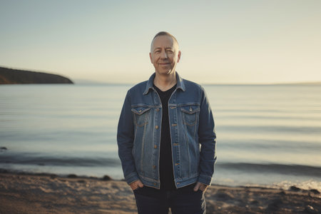 Portrait of a middle-aged man in a denim jacket on the beach.