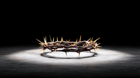 Symbolic crown of thorns displayed against an isolated dark backdrop represents the deep suffering of Jesus Christ for human salvation during Easter.