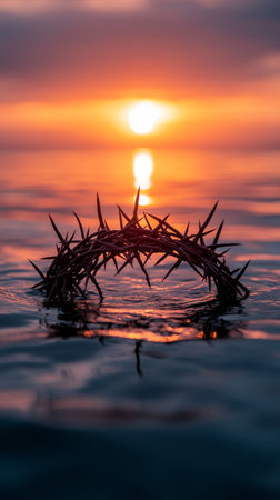 Thorny crown floating on serene water at sunset with vibrant orange sky reflection. Symbolic and spiritual imagery concept