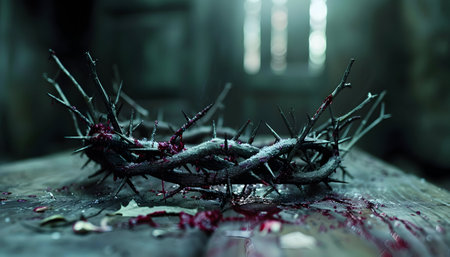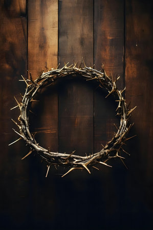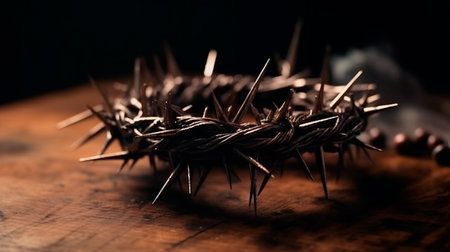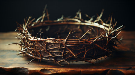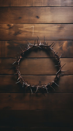 A somber depiction of a crown of thorns, resting on a wooden surface, symbolizing sacrifice and redemption.