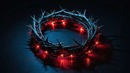 A striking image of a crown of thorns encircled in shadows and red light, representing suffering, sacrifice, and spiritual devotion. Ideal for thematic art.