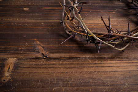 A crown on thorns, a religious symbol on a wooden background - Easter background