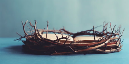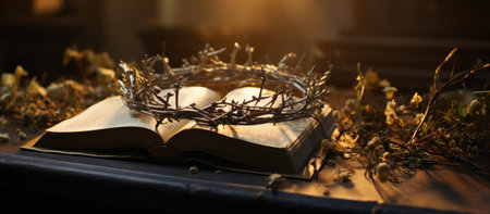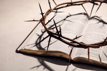 A crown of thorns rests on a Bible, symbolizing sacrifice and faith