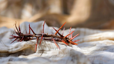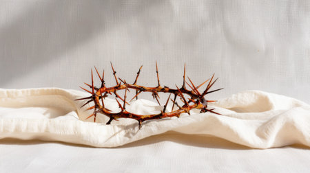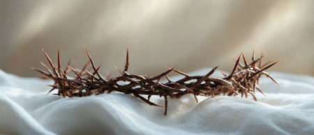 A thorny crown rests on soft fabric, encapsulating themes of sacrifice and suffering. This evocative still life speaks to deep spiritual and historical significance.