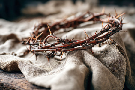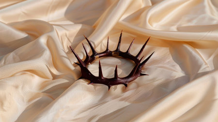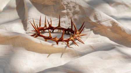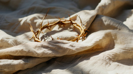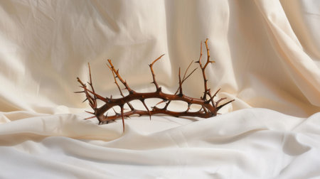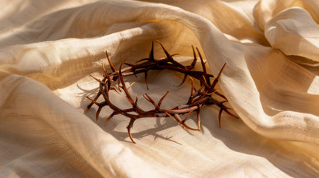 This image captures a crown of thorns resting on soft fabric, symbolizing sacrifice and suffering within a profound religious context, showcasing intricate details.