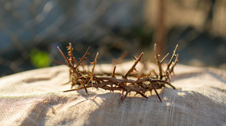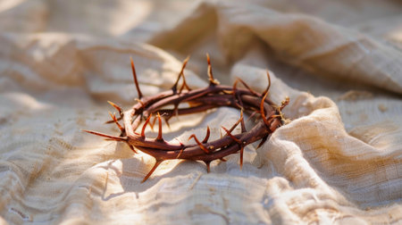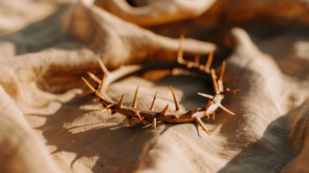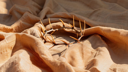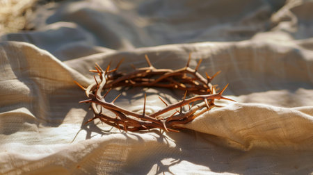 This captivating image features a crown of thorns resting on a soft fabric surface, illuminated by warm sunlight, creating a serene and contemplative atmosphere.