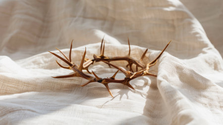 A beautiful crown made of thorny branches rests gently on soft fabric, illuminated by natural light. This minimalistic still life captures elements of nature and simplicity, perfect for artistic projects.