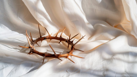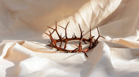 A serene crown of thorns rests on soft, draped fabric, capturing light and shadow beautifully in an artistic composition. Perfect for themes of spirituality and faith.