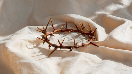 An artistic depiction of a thorn crown resting elegantly on soft fabric, surrounded by gentle natural light. This piece evokes themes of spirituality, beauty, and craftsmanship.