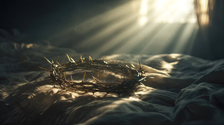 A captivating scene featuring a crown of thorns resting on soft bedding, illuminated by gentle sunlight. This image evokes themes of spirituality and serenity.