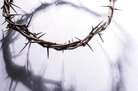 Crown of thorns casting a distinct shadow a white background, creating a symbolic easter image of suffering, sacrifice, and remembrance Copy space good text friday