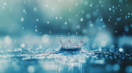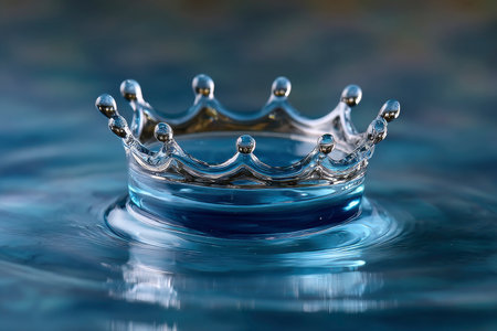 A captivating close-up of a water droplet creating ripples, forming a crown shape against a serene blue background. The image exudes beauty and tranquility, perfect for creative projects.