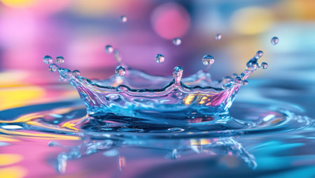 Water splash with a colorful background, water droplets, and a crown-like shape on the surface. Water drops falling from above with a motion blur effect. This image could be used as a background for design or advertising. Macro shot, Sony Alpha A7 III, natural colors, stock photo, Unsplash, high quality. --ar 53:30 --v 6.1 Job ID: 2643b38e-9959-4ffc-9ae7-0e5dd5cbb58e