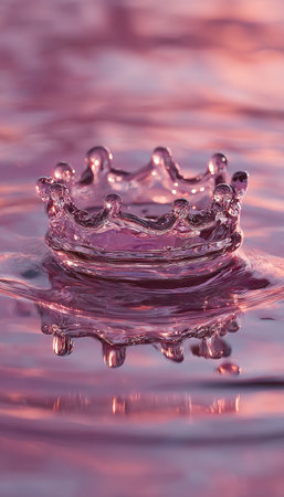 A water droplet forms a crown splash, captured against a colorful sunset. The image displays a smooth, reflective surface with a dynamic upward splash. The composition features rich pinks and oranges, suggesting an outdoor setting with dramatic lighting, suitable for various editorial and commercial applications.