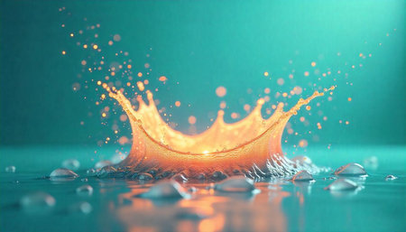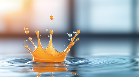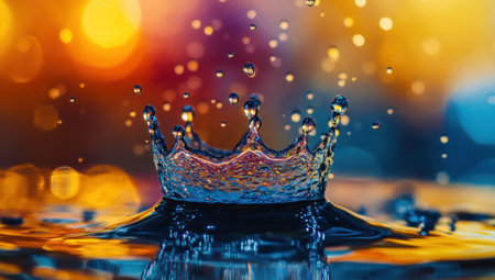 A detailed water splash forms an crown shape, set against a soft, out-of-focus golden bokeh background creating a...