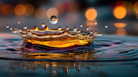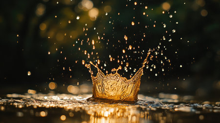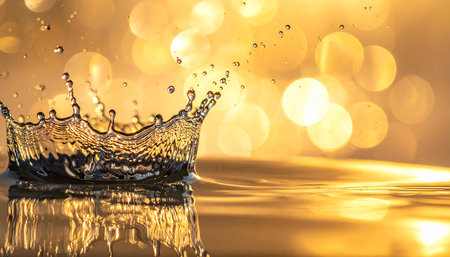 Boke showing golden water crown splash with soft bokeh lights and sunlit reflections. resolution