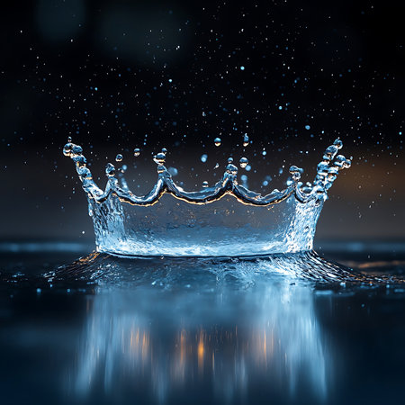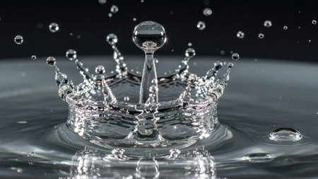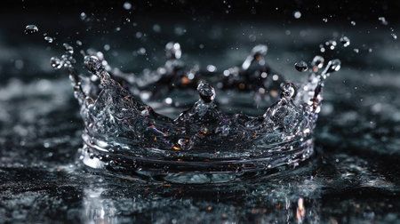 Captivating close-up of a water splash creating a crown shape, showcasing the beauty of droplets against a dark backdrop, perfect for creative and abstract visuals.