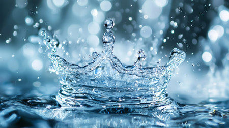 A captivating image of a water drop creating a crown splash in a serene blue backdrop, featuring beautiful bokeh effects and soft reflections.