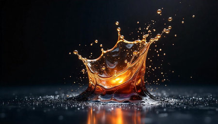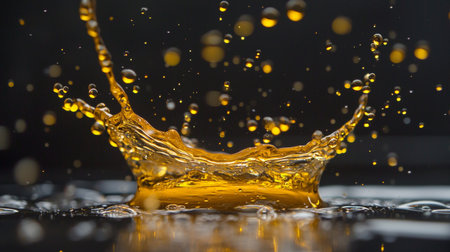 A dynamic close-up of a golden liquid splash frozen in motion, with droplets captured against a dramatic dark background.