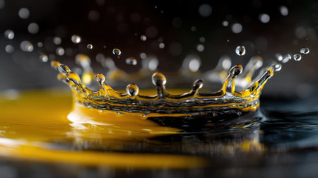 A captivating close-up image of a water droplet creating a stunning splash, showcasing a crown shape in vibrant yellow and dark tones. Perfect for artistic design projects.
