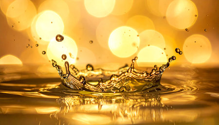Boke showing golden liquid splash crown formation with soft yellow bokeh lights and reflections. resolution...