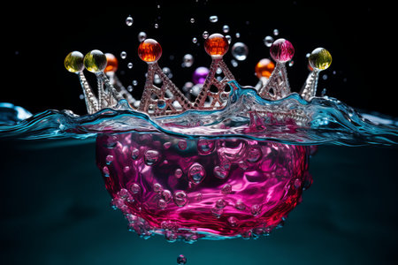 Crown dropping gracefully in water creating elegant ripples and reflections. Concept Water Droplets, Crown Photography, Elegant Ripples, Reflective Surfaces, Graceful Movement