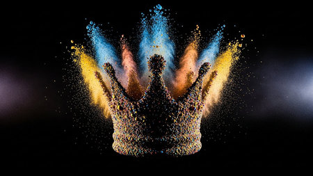 Digital composite of Colourful explosion with glittering crown against black background