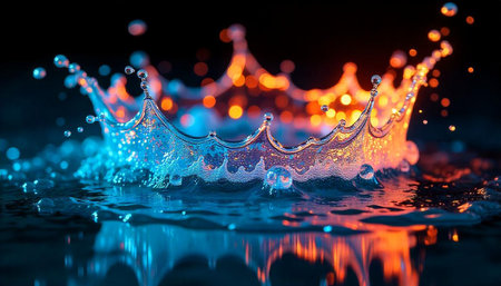 Captivating close-up image of water splashing in a dark setting, highlighting the intricate crown shape formed by droplets in dynamic motion.