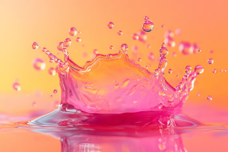 A radiant pink and orange oil splash frozen mid-motion, with droplets scattering across a glossy surface.