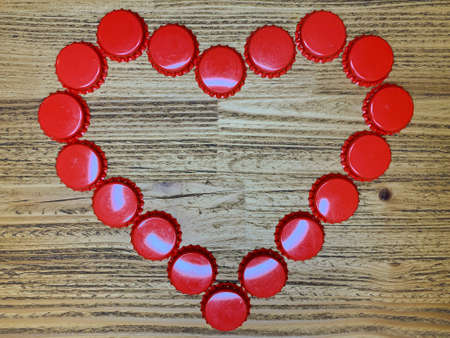 Red love heart made from beer bottle tops lids on a rustic wooden table. Beer drinkers Valentine's day concept, top view horizontal stock image.
