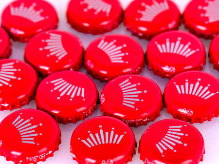 BERLIN - JUNE 23: Used, damaged classic Coca Cola cap isolated on white. Top and side views of cola caps in Berlin, June 23, 2021 in Germany