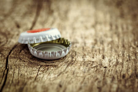 old already rusty beer bottle cap on vintage wooden stripped table outdoors