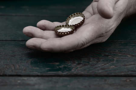 The social problem of drunkenness, alcoholism concept. Close-up of a grown man's hand holding two beer stoppers.