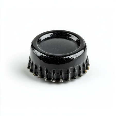 Close-up view of a black bottle cap on a white background. This isolated object highlights simple design features perfect for various creative projects and commercial use.