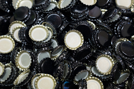 Bottle caps, side by side on black background. Collage of many small bottle caps, beer bottle caps, metal bottle caps. Closeup, texture, background
