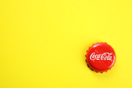 MYKOLAIV, UKRAINE - NOVEMBER 15, 2018: Coca Cola lid on color background, top view. Space for text