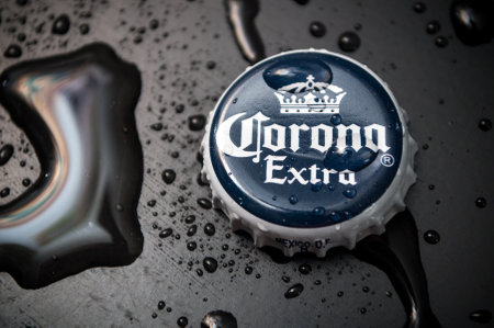 Mulhouse - France - 19 February 2020 - CLoseup of drops of water on corona bier caps on black background