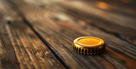 A close-up of a golden bottle cap on textured wooden surface bathed in warm light.