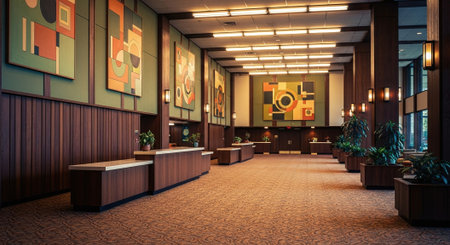 A spacious lobby with modern abstract art on the walls, wooden paneling, and decorative plants
