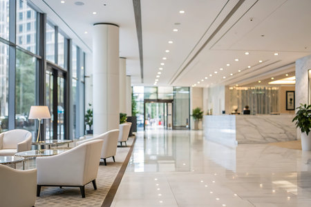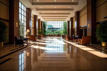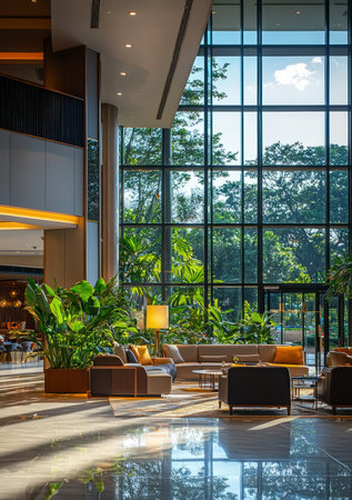 A large, open lobby with floor-to-ceiling glass windows, allowing natural light to flood the space. Generative AI