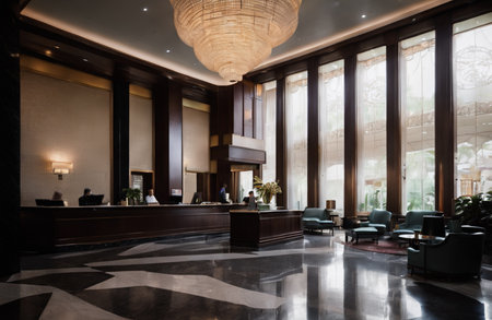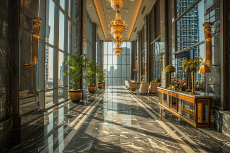 Luxury hotel lobby interior with modern furniture and large windows.
