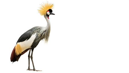 African grey crowned or great golden crested crane - Balearica regulorum - is found in nearly all of Africa, and it is the national bird of Uganda. Isolated on white background with copy space