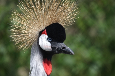Gorgeous bird, head profile of a Grey Crowned Crane with blue eyes and crimson wattles