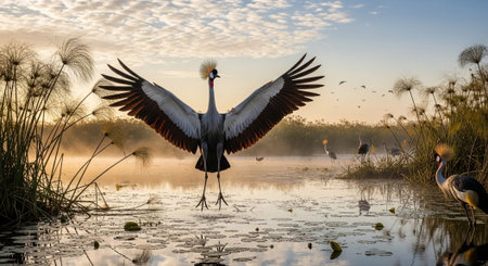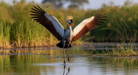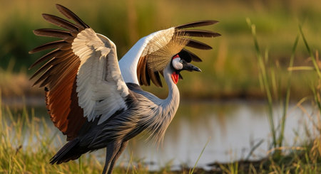Crowned crane dancing gracefully on grassy field, golden hour glow, soft bokeh background.