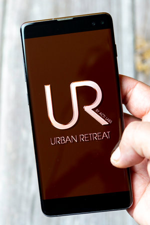 04-13-2021 Portsmouth, Hampshire, UK A Mobile phone or Cell phone being held in a hand showing the urban retreat app on screen