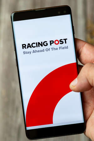04-13-2021 Portsmouth, Hampshire, UK A Mobile phone or Cell phone being held in a hand showing the racing Post app on screen